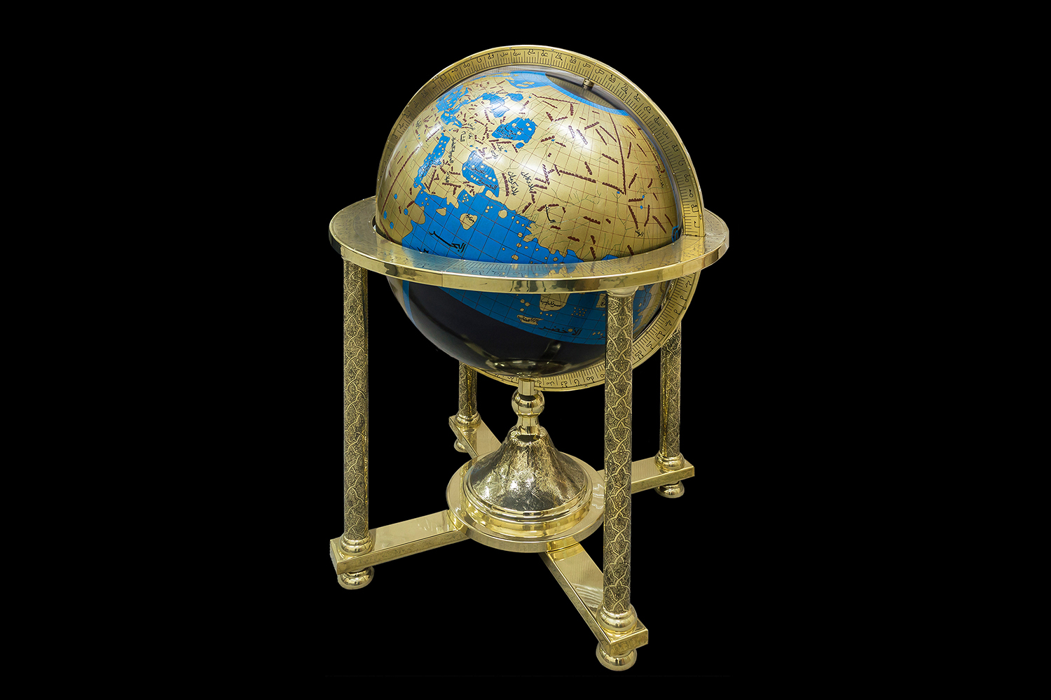 This terrestrial globe reproduces a world map which was drawn at the instance of the Abbasid Caliph al-Ma’mūn by a group of scholars in the first quarter of the ninth century AD. The scholars based their map on the image of the world as known to their Greek predecessors, but they improved and extended the image considerably, and depicted it upon a grid with the help of longitudes and latitudes, which they had determined mostly by astronomical-mathematical procedures.